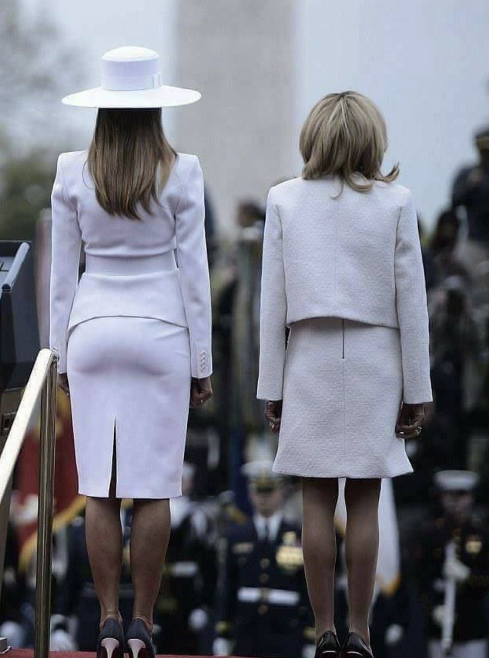 Кроме того, стало популярным фото, на котором супруги двух президентов сняты сзади. Мелания Трамп и Бриджит Макрон выбрали похожие наряды – светлые костюмы из юбки с жакетом и туфли на каблуках. Эта схожесть только подчеркнула разницу в фигурах первых леди.