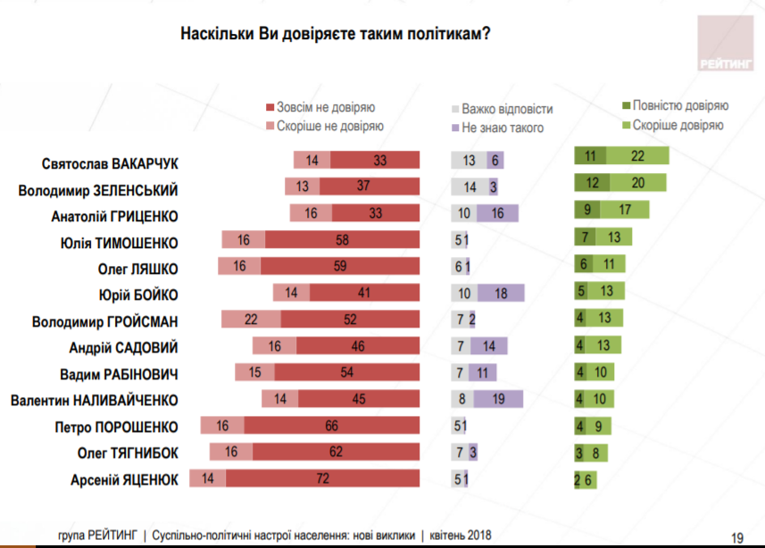 У Владимира Зеленского и Святослава Вакарчука, которые с недавних пор рассматриваются как "новые лица" в гипотетической предвыборной гонке, тоже есть свой антирейтинг. Причем немалый. Исполнителю главной роли в "Слуге народа" не доверяет 50% опрошенных, а певцу - 47%.