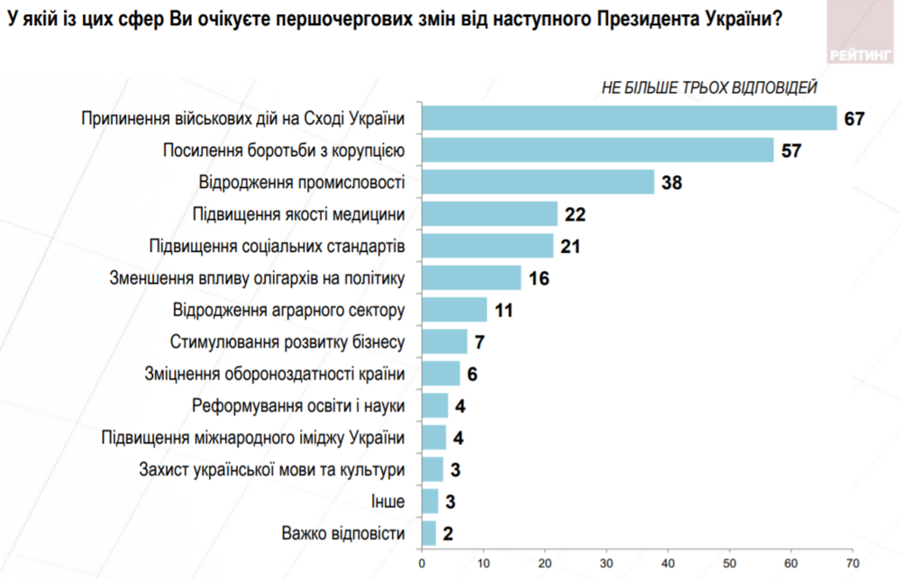 Львиная доля опрошенных - 67% - ждут прекращения военных действий на востоке Украины. Второе главное требование - победа над коррупцией (57%). После нее идет возрождение промышленности, повышение качества медицины и социальных стандартов. Эти требования разделяют от 38 до 21% опрошенных.