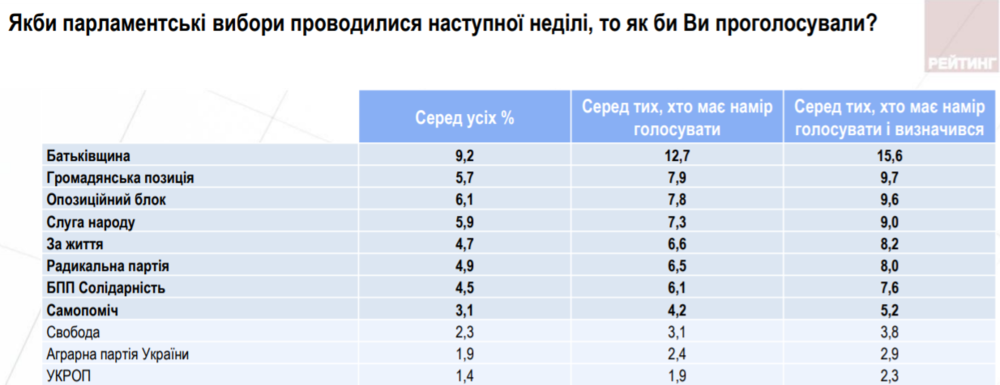 Примерно похожим образом выглядит список партий, за которые бы проголосовали украинцы. Более 9% среди всех респондентов набирает "Батькивщина", более 6% - Оппозиционный блок, за ним следует "Слуга народа" Зеленского сразу проходит 5-процентный барьер.