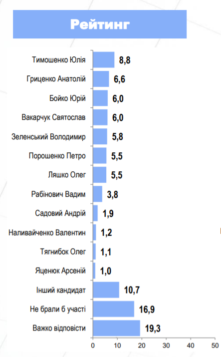 Второе и третье место поделили бы Анатолий Гриценко и Юрий Бойко. Вакарчук и Зеленский заняли бы четвертое и пятое места. И лишь на 6-м месте следом за ними "приютился" действующий президент Петр Порошенко.