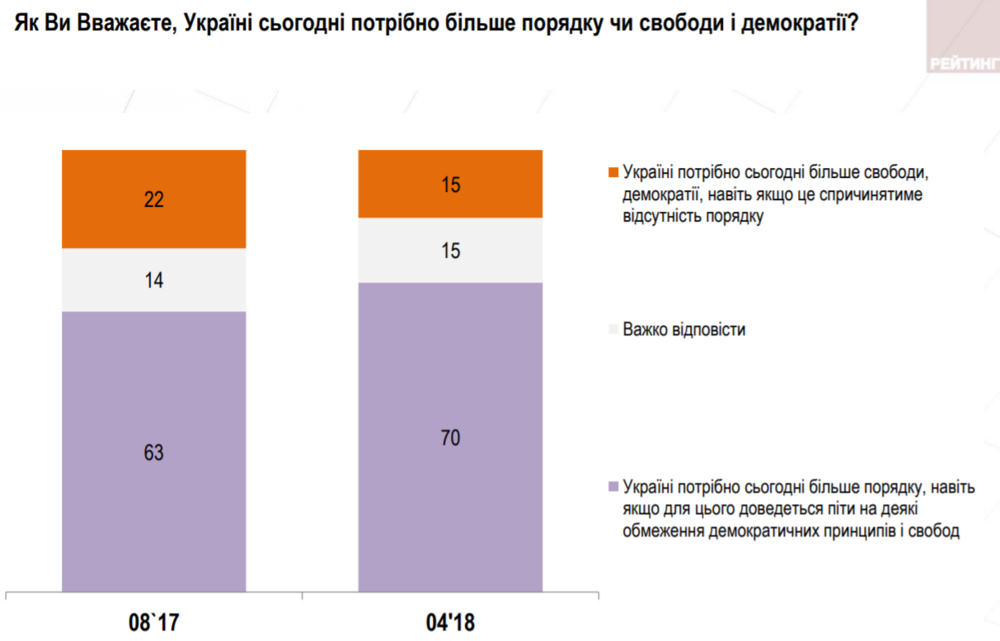 Наконец, еще один тренд. Ради стабильности и порядка украинцы готовы пойти на ограничение своих прав и свобод. Причем в 2018 году количество считающих так возросло.