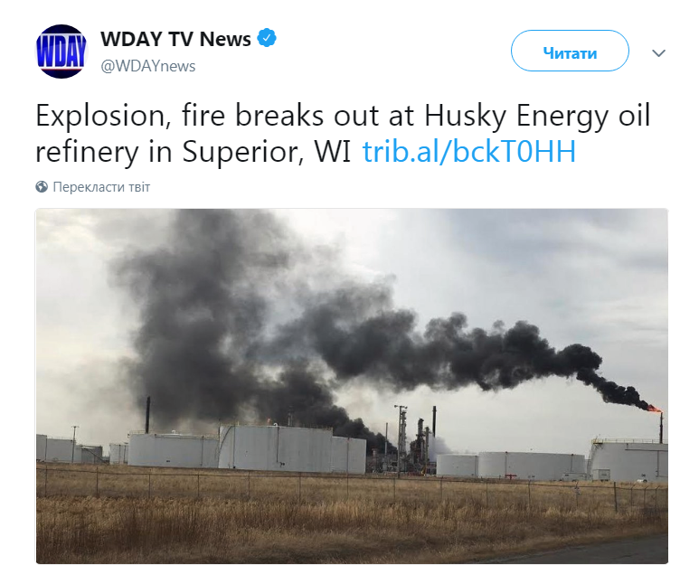 В четверг, 26 апреля на нефтеперерабатывающем заводе в городе Сьюпириор (штат Висконсин, США) случился взрыв. В результате пострадало около 20 человек.