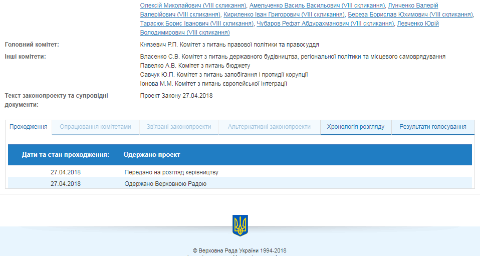 Согласно информации на сайте парламента, соответствующий законопроект был зарегистрирован в пятницу, 27 апреля 2018.
