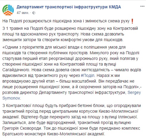 "В прошлом году на Подоле стартовал первый этап реорганизации дорожного движения, который заключался в создании пешеходной зоны на Контрактовой площади и улице Сагайдачного. Новая схема доказала свою жизнеспособность - многие водители отказались от транзитного движения через Разделение. Пока же мы внедряем второй этап - более масштабный. Он предусматривает не только расширение пешеходной зоны, но и сокращение пробок на Подоле", - рассказал директор департамента транспортной инфраструктуры Сергей Симонов.