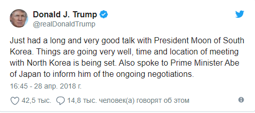 "Провел долгий и очень хороший разговор с президентом Южной Кореи Муном. Дела идут очень хорошо, время и место предстоящей встречи с руководством Северной Кореи согласовано. Также поговорил с премьер-министром Японии Абэ, чтобы проинформировать его о проходящих переговорах", - написал Трамп.