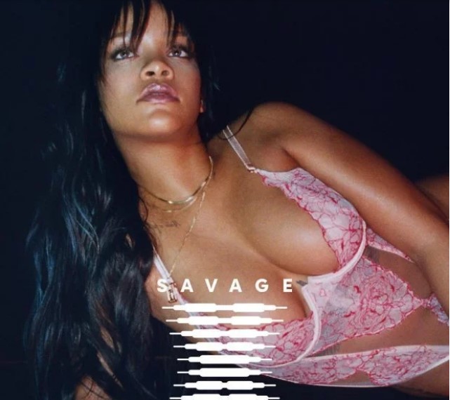 На фото на ней - нижнее белье собственного бренда "Savage x Fenty" - розовое боди с кружевами.