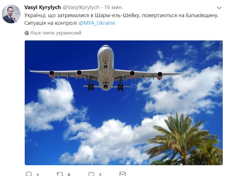 В свою очередь глава МИД Украины Павел Климкин написал в Twitter: "По поручению президента круглосуточно работаем, чтобы помочь нашим гражданам вылететь из отдыха в Египте. Способствуем размещению и обновлению графику авиарейсов. Считаю, что наши туроператоры имеют будущее сделать выводы из сложившейся ситуации".