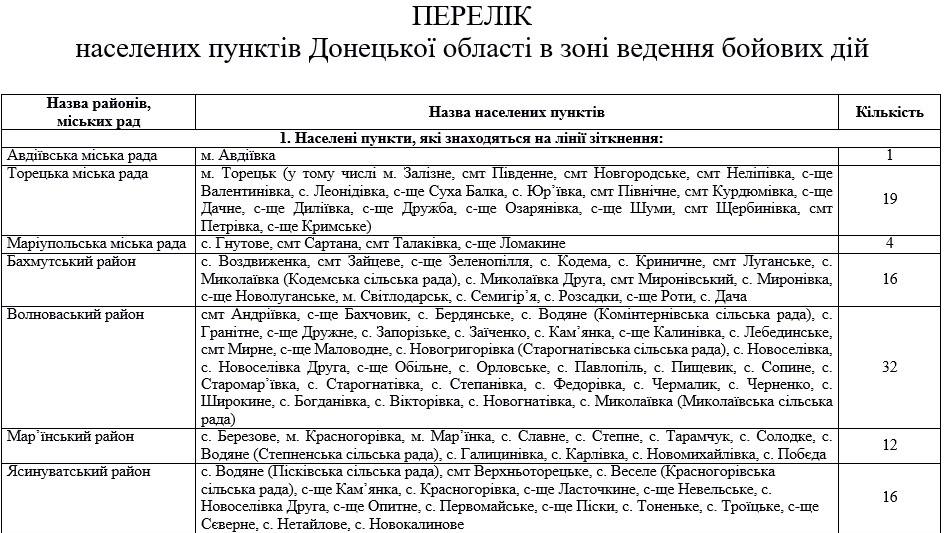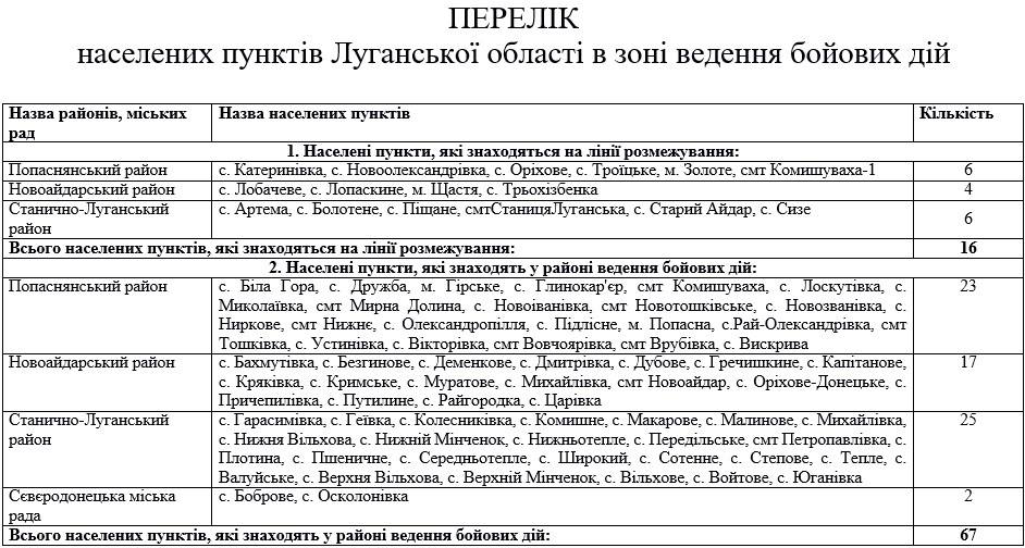 Опубликован новый перечень населенных пунктов Донецкой и Луганской областей, входящих в зону боевых действий согласно новым правилам в связи с началом проведения операции объединенных сил.