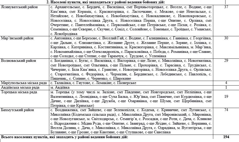 Сообщалось также, что зоной безопасности, прилегающей к району боевых действий, считается: Виноградное, Курахово, Очеретяное, Розивка, Вовчеяровка, Белая гора, Новоайдар, Садки, Макаровка, Простяное, вдоль админграницы Луганской и Харьковской областей, Ольговка, вдоль админграницы Донецкой и Харьковской областей, Знаменивка, вдоль админграницы Донецкой и Днепропетровской областей, Комишеваха, вдоль админграницы Донецкой и Запорожской областей, Урзуф, вдоль морского побережья, Приморское.