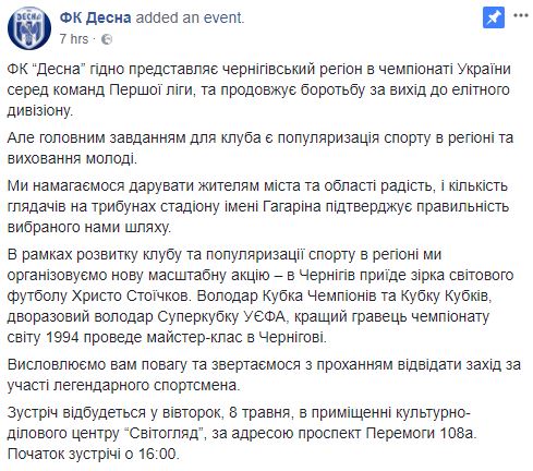 "В рамках развития клуба и популяризации спорта в регионе мы организуем новую масштабную акцию - в Чернигов приедет звезда мирового футбола Христо Стоичков. Обладатель Кубка Чемпионов и Кубка Кубков, двукратный обладатель Суперкубка УЕФА, лучший игрок чемпионата мира 1994. Он проведет мастер-класс в Чернигове", - говорится в сообщении.