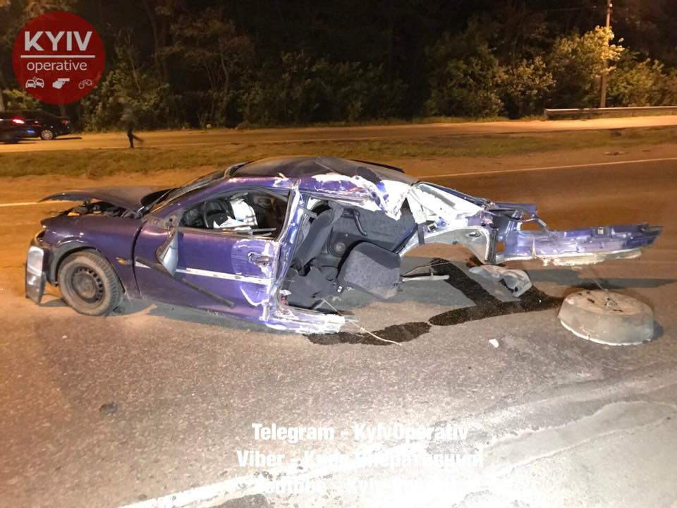 По словам патрульных, Opel двигался по Палладина в сторону Пущи-Водицы. По неизвестным причинам автомобиль занесло, после чего он врезался в опору рекламного щита. В результате столкновения машину разорвало на две части.