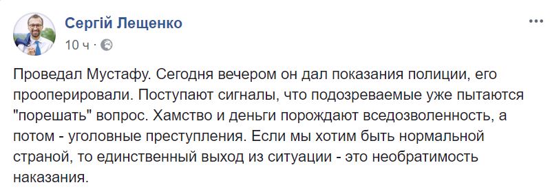 "Проведал Мустафу. Сегодня вечером он дал показания полиции, его прооперировали", – написал Лещенко.