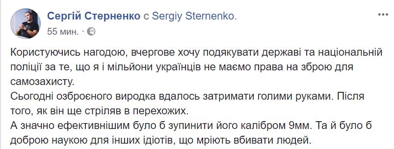 По его словам, нападавший выстрелил ему в область шеи сзади из пистолета, а затем, при задержании, стрелял по очевидцам инцидента. Сам Стерненко, несмотря на ранение, также участвовал в задержании стрелявшего.
