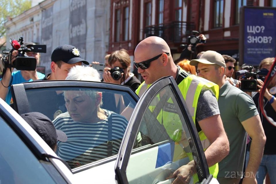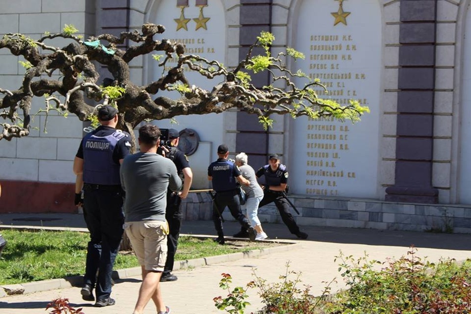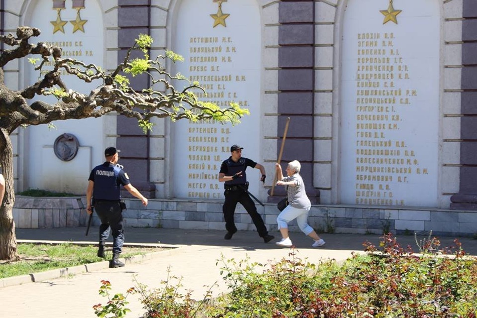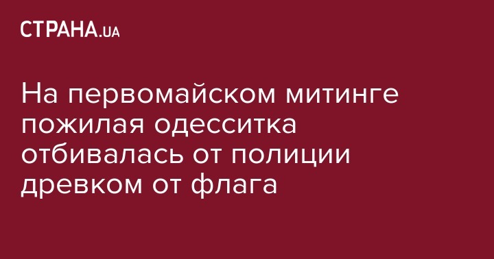 На первомайском митинге пожилая одесситка отбивалась от полиции древком от флага