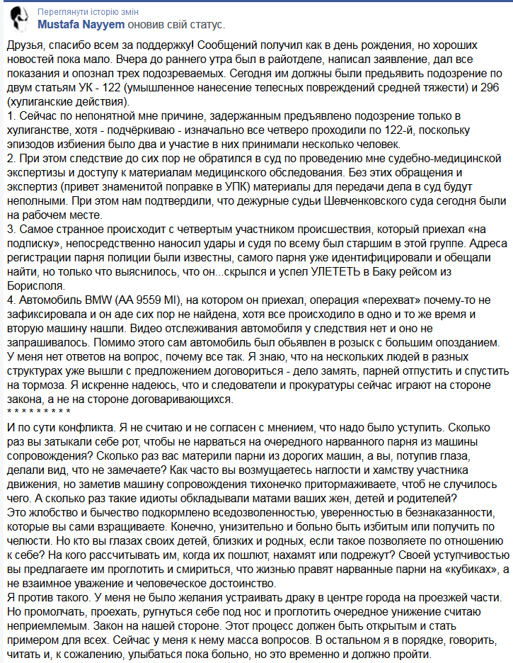 "Друзья, спасибо всем за поддержку! Сообщений получил как в день рождения, но хороших новостей пока мало. Вчера до раннего утра был в райотделе, написал заявление, дал все показания и опознал трех подозреваемых. Сегодня им должны были предьявить подозрение по двум статьям УК - 122 (умышленное нанесение телесных повреждений средней тяжести) и 296 (хулиганские действия).