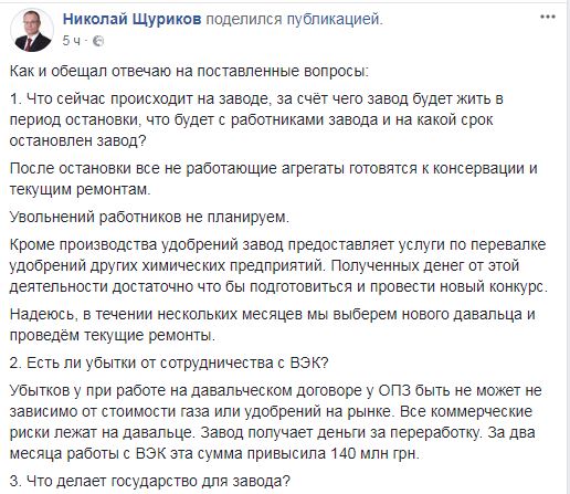 "Надеюсь, в течение нескольких месяцев мы выберем нового давальца и проведём текущие ремонты. Убытков при работе на давальческом договоре у ОПЗ быть не может независимо от стоимости газа или удобрений на рынке. Все коммерческие риски лежат на давальце. Завод получает деньги за переработку. За два месяца работы с ВЭК эта сумма превысила 140 миллионов гривен", — добавил замдиректора.