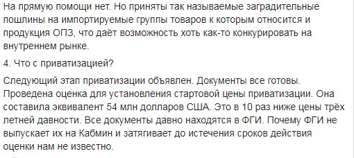 Николай Щуриков рассказал и о ситуации с приватизацией ОПЗ. "Следующий этап приватизации объявлен. Документы все готовы. Проведена оценка для установления стартовой цены приватизации. Она составила эквивалент 54 млн долларов США. Это в 10 раз ниже цены трехлетней давности. Все документы давно находятся в ФГИ. Почему ФГИ не выпускает их на Кабмин и затягивает до истечения сроков действия оценки, нам не известно", — отметил он.