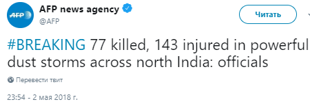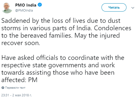 "Опечален потерями из-за песчаных бурь в различных частях Индии. Выражаю глубокие соболезнования семьям погибших. Мы направили команды спасателей в разные регионы для оказания помощи пострадавшим", – написал на своей странице в Twitter премьер-министр Индии Нарендра Моди.