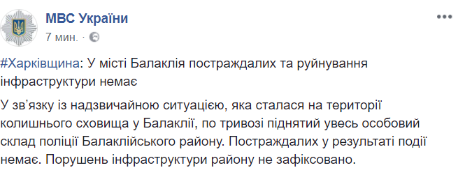 "В Балаклее на Харьковщине снова взрывы. По словам местных жителей, детей отпустили из школы", - написал в Facebook нардеп Роман Семенуха.