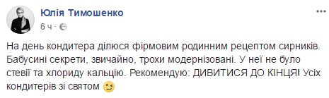 Кроме рецепта сырников и поздравлений с Днем кондитера, который действительно отмечается 3 мая, Тимошенко "обратилась к одному очень известному политику" с призывом "вернуться в профессию", намекая на Петра Порошенко.