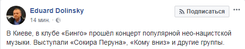 В Киеве, в клубе "Бинго" прошел рок-концерт, на который пришли в том числе и люди неонацистских взглядов и с атрибутикой Третьего рейха. Многие были в футболках со свастикой и в нацистских тату.