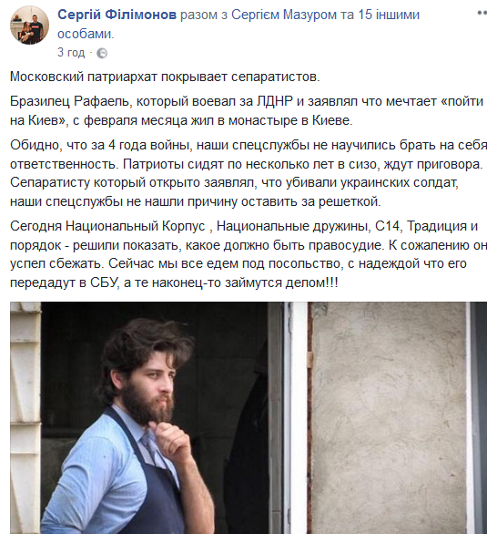 Вот что пишет об этом Филимонов на своей странице в Facebook: "Бразилец Рафаэль, который воевал за "ЛДНР" и заявлял, что мечтает "пойти на Киев", с февраля месяца жил в монастыре в Киеве. Обидно, что за 4 года войны, наши спецслужбы не научились брать на себя ответственность. Патриоты сидят по несколько лет в СИЗО, ждут приговора. Сепаратиста, который открыто заявлял, что убивал украинских солдат, наши спецслужбы не нашли причины оставить за решеткой. Сегодня Национальный Корпус, Национальные дружины, С14, Традиция и порядок - решили показать, какое должно быть правосудие.