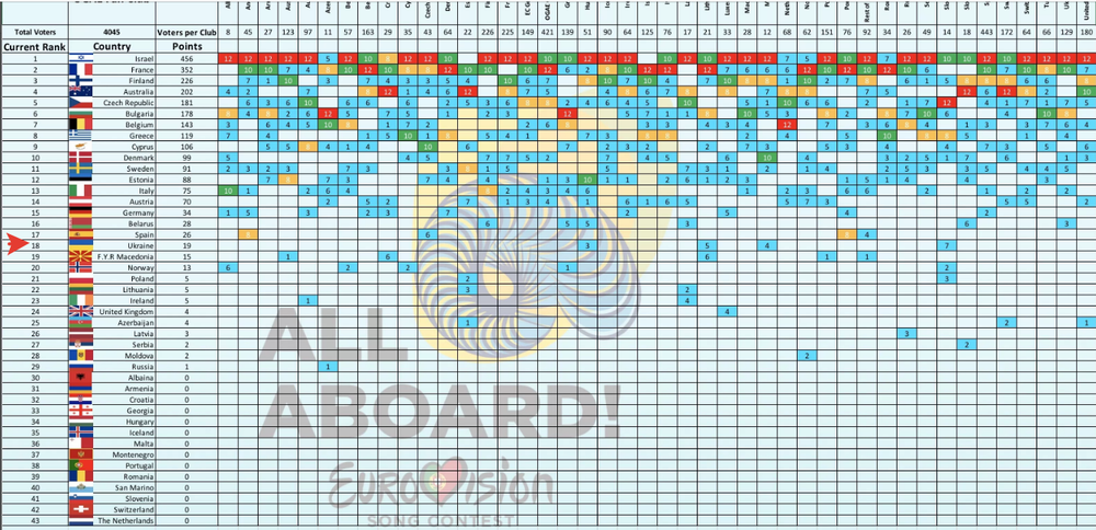 По суммарному количеству голосов Израиль набирает 456 баллов, затем с 352 баллами следует Франция, на третьем месте - Финляндия, которая значительно отстает от Франции (234 голоса).