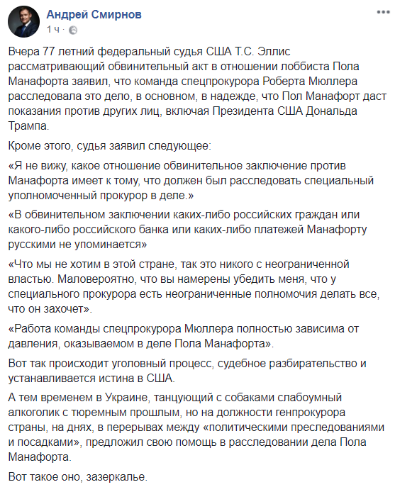 Украинский юрист Андрей Смирнов отреагировал в Facebook на заявления судьи: