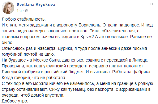 "Отвели на допрос. И под запись видеокамеры заполняют протокол. Типа, объяснительная, с главным вопросом: зачем вы ездили в Крым? А это новенькое. Раньше не было. Объяснюсь раз и навсегда. Дурики, я туда после аннексии даже письма голубиной почтой не шлю", – написала заместитель главреда "Страны".