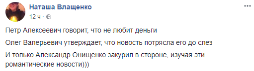 "Петр Алексеевич говорит, что не любит деньги. Олег Валерьевич утверждает, что новость потрясла его до слез. И только Александр Онищенко закурил в стороне, изучая эти романтические новости", - прокомментировала телеведущая Наталья Влащенко.
