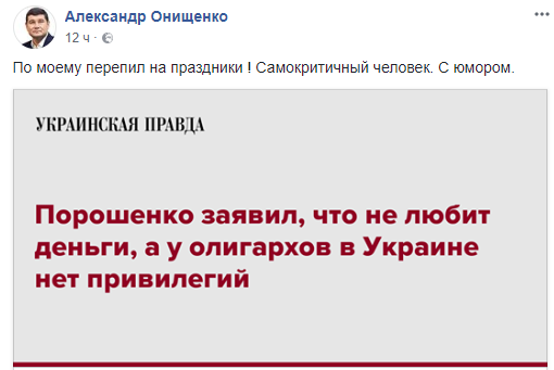 "По моему перепил на праздники ! Самокритичный человек. С юмором", - написал Онищенко.