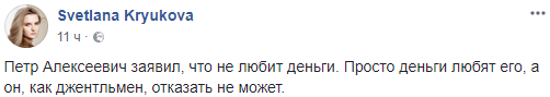 "Петр Алексеевич заявил, что не любит деньги. Просто деньги любят его, а он, как джентльмен, отказать не может", - интерпретировала ответ президента заместитель главного редактора "Страны" Светлана Крюкова.