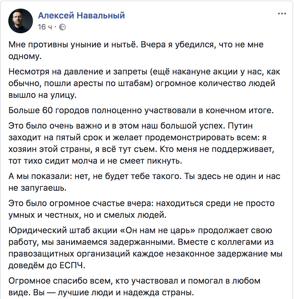 "Несмотря на давление и запреты (ещё накануне акции у нас, как обычно, пошли аресты по штабам) огромное количество людей вышло на улицу. Больше 60 городов полноценно участвовали в конечном итоге. Это было очень важно и в этом наш большой успех. Путин заходит на пятый срок и желает продемонстрировать всем: я хозяин этой страны, я всё тут съем. Кто меня не поддерживает, тот тихо сидит молча и не смеет пикнуть. А мы показали: нет, не будет тебе такого. Ты здесь не один и нас не запугаешь.