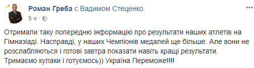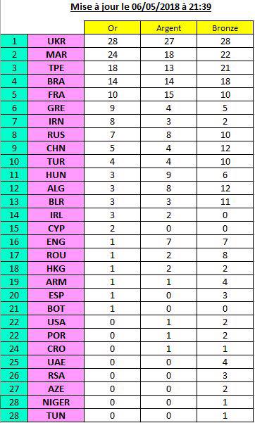 По его данным, на утро 7 мая, после четырех дней соревнований, украинские школьники стали обладателями 83 наград. Среди них - 28 золотых медалей, 27- серебряных и 28- бронзовых. У следущей в рейтинге сразу за украинцами Национальной сборной Марокко - 64 медали (на 19 меньше). На третьем месте - сборная Тайпея с 52 медалями. На данный момент медали Всемирной Гимназиады заработали спортсмены-школьники 28 стран.
