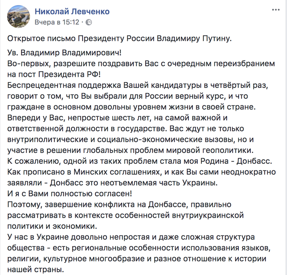 Экс-нардеп от Партии регионов, бывший секретарь Донецкого горсовета Николай Левченко попросил президента России Владимира Путина прекратить поддержку так называемых "ЛДНР" и передать их под контроль международных миротворческих сил.