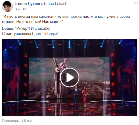 "Браво, "Интер"! И спасибо! С наступающим Днем Победы!", - написала в соцсети Елена Лукаш.
