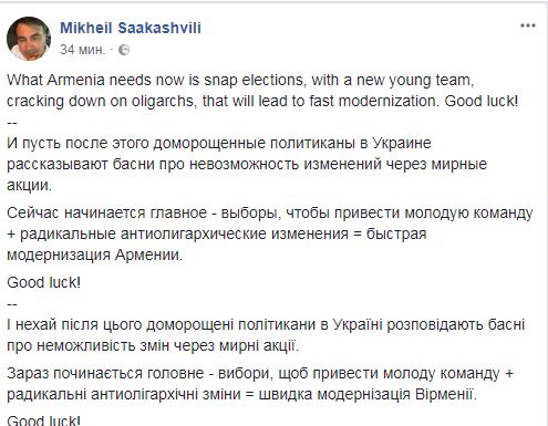 "И пусть после этого доморощенные политиканы в Украине рассказывают басни про невозможность изменений через мирные акции. Сейчас начинается главное - выборы, чтобы привести молодую команду + радикальные антиолигархические изменения = быстрая модернизация Армении", -написал он.