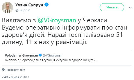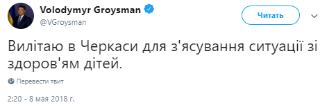 Премьер-министр Украины Владимир Гройсман срочно выехал в Черкассы в связи с массовым отравлением детей неизвестным веществом в средней школе №8. Об этом он написал в  своем микроблоге Тtwitter.