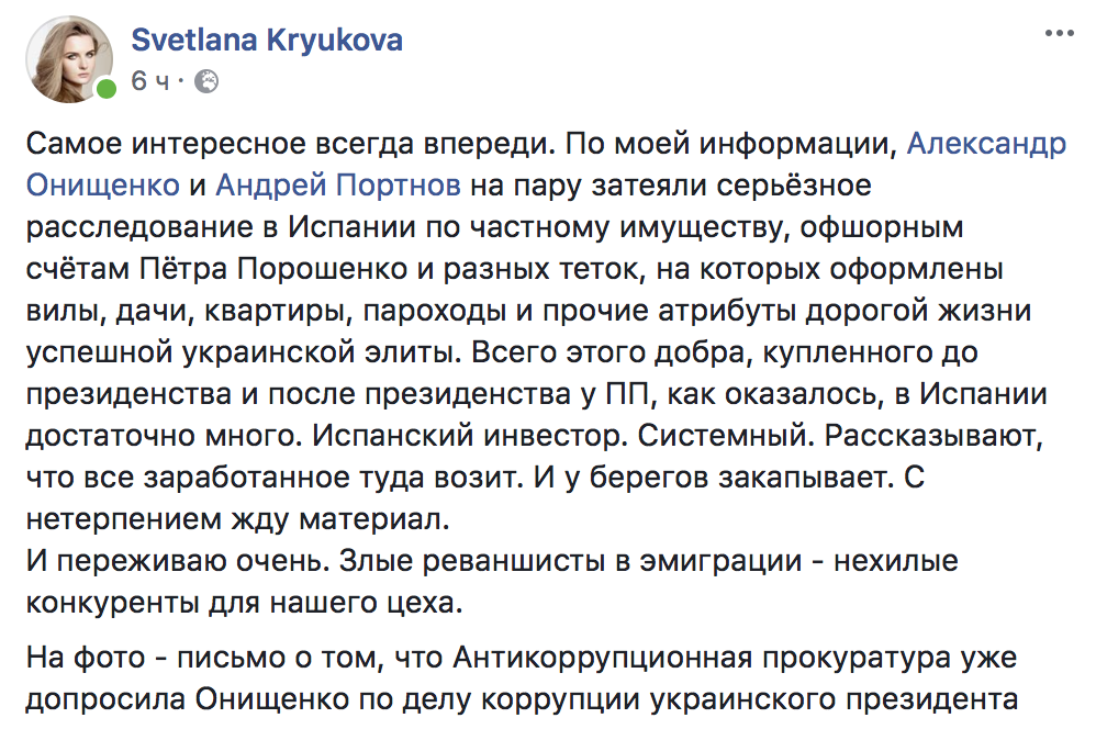 Ранее заместитель главного редактора "Страны" Светлана Крюкова написала у себя в ФБ, что Александр Онищенко и Андрей Портнов "затеяли серьезное расследование в Испании по частному имуществу, офшорным счетам Петра Порошенко и разных теток, на которых оформлены виллы, дачи, квартиры, пароходы и прочие атрибуты дорогой жизни успешной украинской элиты. Всего этого добра, купленного до президентства и после президентства у ПП, как оказалось, в Испании достаточно много. Испанский инвестор. Системный. Рассказывают, что все заработанное туда возит. И у берегов закапывает. С нетерпением жду материал. И переживаю очень. Злые реваншисты в эмиграции – нехилые конкуренты для нашего цеха".