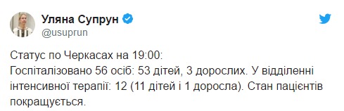 "Статус по Черкассам на 19:00. Госпитализированы 56 человек: 53 детей, 3 взрослых. В отделении интенсивной терапии: 12 (11 детей и 1 взрослый). Состояние пациентов улучшается", - написала она.
