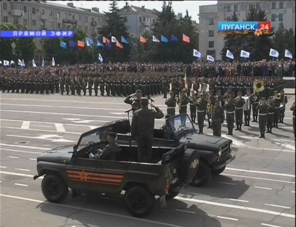 Также парад проводят и в Луганске. Открыл его глава "ЛНР" Леонид Пасечник. Руководитель МВД "республики" Игорь Корнет нарядился в форму генералиссимуса. Парад военной техники и вооружения возглавляет танк Т-34, восстановленный после повреждений, полученных при артиллерийском обстреле.