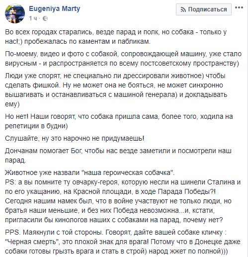 Блогер Евгения Мартынова пишет о собаке, которая преследовала машины на параде в Донецке: "Во всех городах старались, везде парад и полк, но собака - только у нас!;) пробежалась по каментам и пабликам. По-моему, видео и фото с собакой, сопровождающей машину, уже стало вирусным - и распространяется по всему постсоветскому пространству)