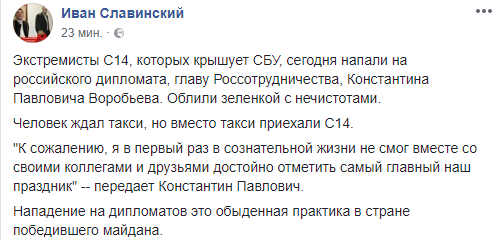 "Экстремисты С14, которых крышует СБУ, сегодня напали на российского дипломата, главу Россотрудничества, Константина Павловича Воробьева. Облили зеленкой с нечистотами. Человек ждал такси, но вместо такси приехали С14", – написал Славинский.