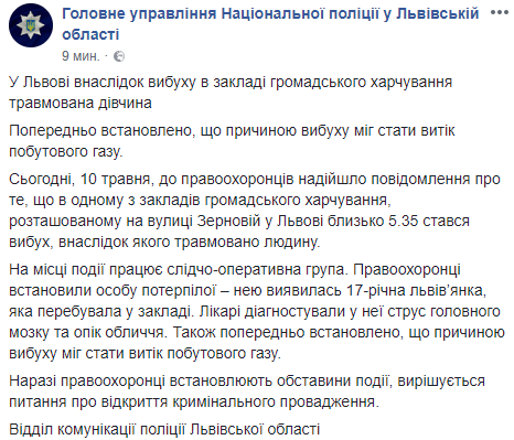 10 мая в полицию поступило сообщение, что в одном из заведений общественного питания, расположенном на улице Зерновой во Львове около 05:35 произошел взрыв, в результате которого пострадал человек.