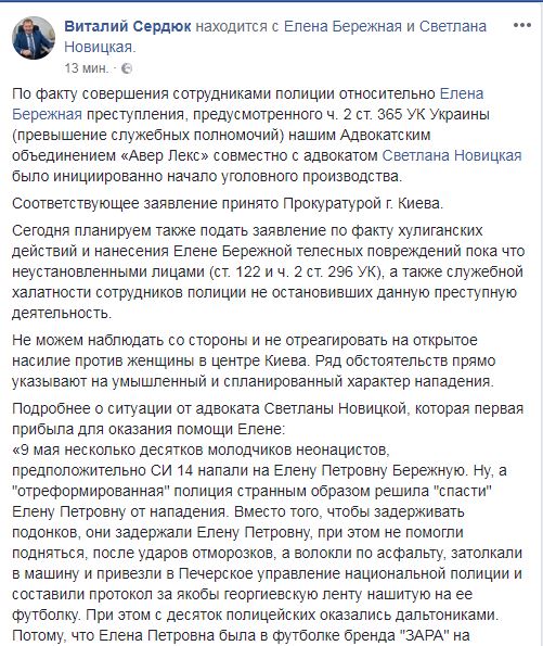 "По факту совершения сотрудниками полиции относительно Елены Бережной преступления, предусмотренного ч. 2 ст. 365 УК Украины (превышение служебных полномочий) нашим адвокатским объединением "Авер Лекс" совместно с адвокатом Светланой Новицкой было инициированно начало уголовного производства" - сообщил он.