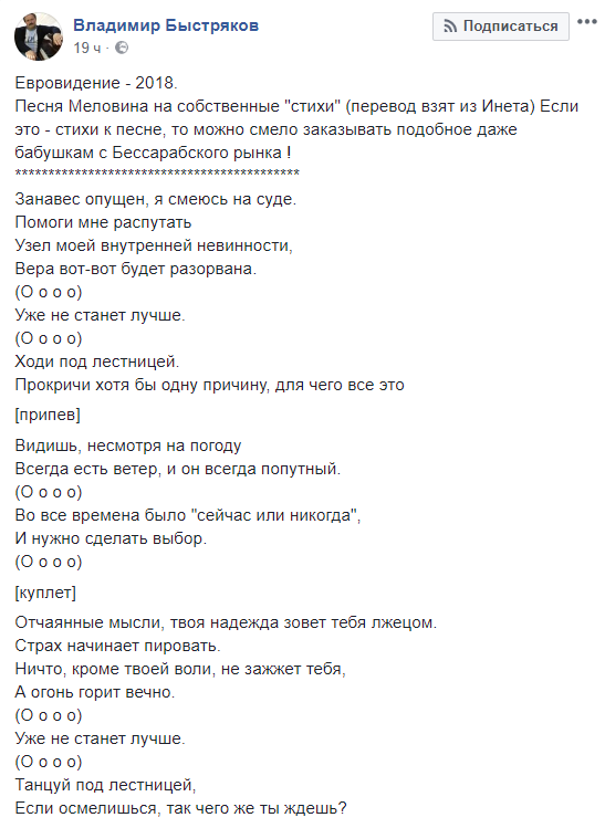 13.31 - "Песня Меловина на собственные "стихи" (перевод взят из Инета) Если это - стихи к песне, то можно смело заказывать подобное даже бабушкам с Бессарабского рынка", буквально уничтожил украинского участника Евровидения композитор Владимир Быстряков.
