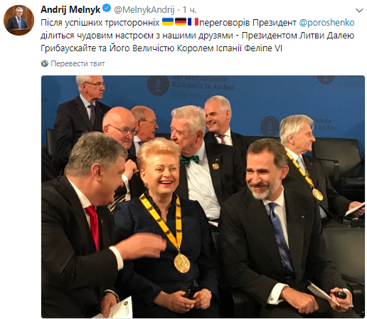 "После успешных трехсторонних переговоров Президент Петр Порошенко делится отличным настроением с нашими друзьями - президентом Литвы Далей Грибаускайте и Его Величеством Королем Испании Фелипе VI", - сообщил дипломат.