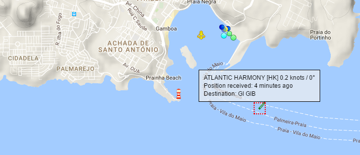 По данным мониторинга передвижения судна, оно сейчас находится на рейде в Кабо-Верде (Острова зеленого мыса), а предыдущим пунктом посещения корабля была Мексика.