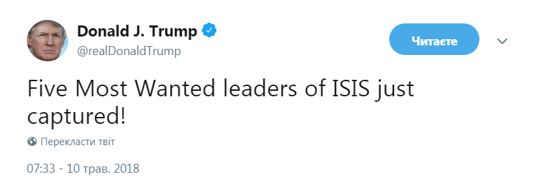 "Пять наиболее разыскиваемых лидеров ИГ схвачены!", - написал он в Twitter, но не назвал ни их имен, ни должностей.